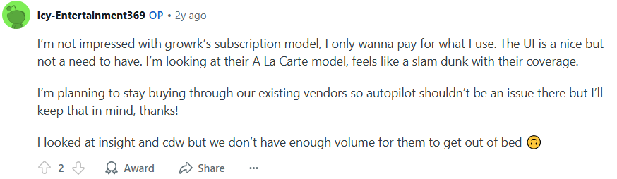 Some users feel GroWrk’s subscription model isn’t flexible enough and prefer the à la Carte option, which allows them to pay only for what they use. They see this as a better fit given GroWrk’s coverage.