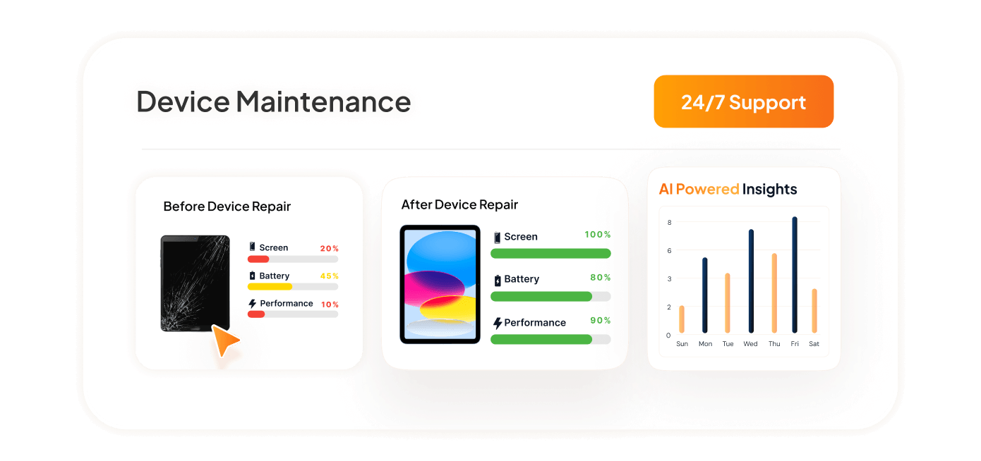 Whether it’s a minor repair or a major fix, With expert technicians, supported by AI diagnostics, quickly identify and resolve device issues.